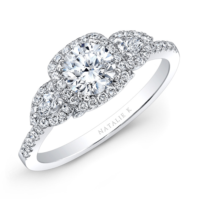 The bottom ring is by Natalie K. The setting is a cushion halo, the center stone is a brilliant cut with twin pear diamonds on each side.