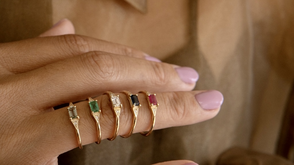 The opening picture for this article features jewelry by Stephen Silver Fine Jewelry. Check out the sultry blood-red hues of the Mozambique rubies and the deep green of the Colombian emerald set in platinum. For women looking for a more petite look, Jennie Kwon just released these beautifully dainty Deco rings in an array of gemstones and colors (pictured below).