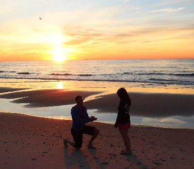 We were on vacation at my grandma’s beach house in Avon-By-The-Sea, New Jersey with my mom, my sister, and Travis’ mom. On August 7th, 2012 me, Travis, his mom and my mom all woke up at 5 A.M. to go watch the sunrise at 6 (Travis doesn’t usually wake up with me to watch it, so I was excited to see it). We had to make sure we got pictures of us with the sunrise behind us As we waited for the sun to come up, Travis kept going up to his mom, who had the camera and making sure she was standing in the right spot for the picture. I had no clue why he was making sure everything was perfect, until we were standing there getting pictures taken and all of a sudden he got down on one knee and held the ring out and asked me to marry him. I burst into tears and of course I said yes! That was the best sunrise I’ve ever seen and we have it captured forever! Travis had the ring for almost three months and had to keep it a secret until vacation. We will never forget that sunrise.
