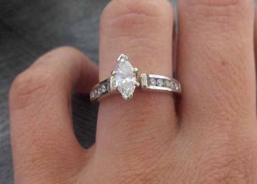 The ring is a ½ Karat diamond, marquise cut with white gold and has 5 diamonds that go down both sides of the ring. It is from Quality Gold and bought from a wholesale market.