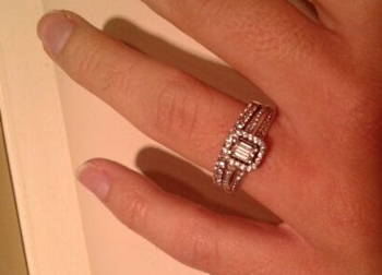 The ring is a vintage style. It is an emerald cut, encased in smaller diamonds. The band is thicker and spit with diamonds on both sides! I LOVE my ring!!