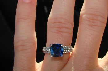 The ring was a collaboration of two different rings selected by my Fiance at Roger’s Jewelers. It is a 2 ct. natural blue Sapphire set in a 14 kt. white gold band lined with 5/8 ct. diamonds