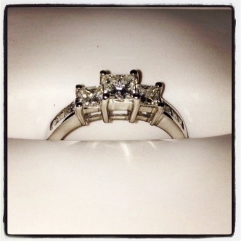 The engagement ring is a 3 stone princess cut with 4 channel diamonds on each side, 1 karat total weight, from Rogers and Hollands.