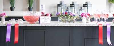 Michelle (the proposal planner): “I really wanted to create a color palette that was fun, young but yet romantic. By bringing in the deeper and lighter purple tones it really lent itself to an elegant look and, of course, what is a love shoot without red! The ribbon wall consisted of over 1000 feet of ribbon in all different textures, sizes and colors and also included strands of white carnation garland to add an extra special touch. The dozens of candles and red rose petals added the final romance factor.”