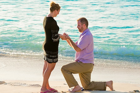 We walked down to the water and Mark was telling me how a week of vacation was not enough time together. He then got down on one knee and told me how he’d like to spend the rest of our lives together and asked me to marry him. As we stood up (after a fist pump from Mark of course) he said “meet my buddy James” and he introduced me to the driver/photographer. At that time I was able to read the imprints of his flip-flops which said “marry me.” The special part about those flip flops was he had to work with the company to switch the words so I could read them while he was facing me rather than walking away from me.