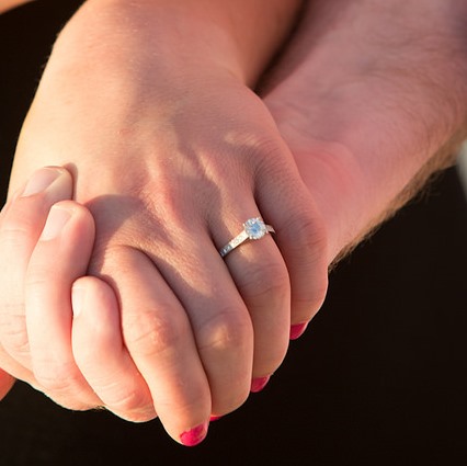 The ring is a round solitaire diamond with channel sets on the side. We had looked at rings a few months prior and picked out the setting together but then Mark picked out the diamond. Ryan Knox from Knox Jewelers designed the ring and did an amazing job.
