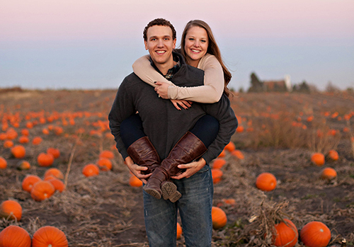 We decided one Saturday last fall that we wanted to go to an apple orchard. We hadn’t been to any near our place, so I researched some favorites online. We decided on one that was about an hour away, but looked great. On our way we ended up taking a wrong turn and driving around for far too long only to find out that the place was closed-oops the article I read was from 2007! We finally found a place that had amazing donuts, apples, cheese, and big pumpkins! After that we went to Minneopa State Park to look at the beautiful MN fall scenery. On the way home Brad suggested that we have a pumpkin carving contest between the two of us. We would each carve a pumpkin in secret and then reveal the finished product at the end. The loser would pay for dinner J I am very competitive, so I traced and carved an elaborate witch’s face. I noticed that Brad was free handing his carving, so I thought I had the competition in the bag. When I was finally done I showed Brad my illuminated pumpkin, with some smart talk I’m sure. I was in for the surprise of my life when he turned his pumpkin around and carved in it were the words, “Marry Me?” He got down on one knee, and I said, “Yes!” It was a perfect day, and yes, he definitely won the competition!