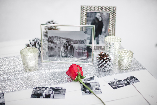 In the middle of this winter wonderland was a table displayed with black and white pictures of us throughout the years. There was also a shadow box that Ryan made for this event, that had a letter telling me how much he loved me and had a collage of pictures of us. Ryan then said his speech, took a single red rose from a 3-dozen bouquet of otherwise white roses, got down on one knee, and asked me to marry him.