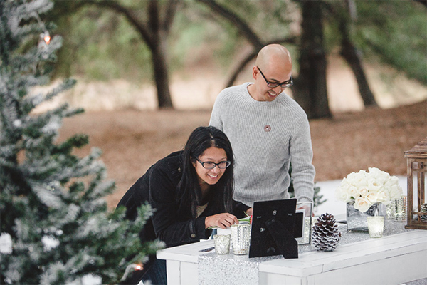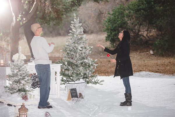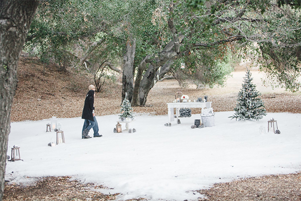 We started off walking on a trail, and in the upcoming meadow, it was clear that there was an event of some kind going on. There were lights and lanterns on the ground and in the trees. I realized there was snow on the ground – a huge 40×40 patch of winter wonderland in the fall, in Malibu. Then, as we stepped onto the snow, I heard The Piano Guys’ cover of Christina Perri’s “A Thousand Years” playing, and I knew what was about to happen. (A couple months back, I had him listen to it as a potential song to which I could walk down the aisle. Song is cliche, I know, but I think it’s cliche for a reason.) At this point, I couldn’t keep it together and my eyes welled up with tears and I felt weak in the knees.