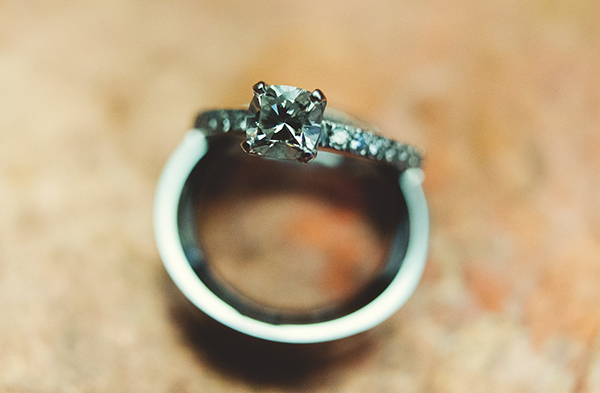 The engagement ring is platinum with a cushion cut stone and diamonds around the band. I could never decide on if I liked square or round cut and cushion cut is a little of both, so when I saw this ring I thought it was perfect! We looked at it a couple times at the store, but I never actually thought he would get it for me. It is from Tiffany’s!