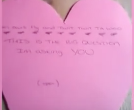When his girlfriend came home from work, he had her follow the candles and glitter to get to the bed. He says, “I promise to clean it all up, just go this way.” She’s ooh-ing and ahh-ing over the beauty of it all, thanking him for being so thoughtful. She sits on the bed, looking at what she thinks is a brochure for somewhere they’re going and then reads a poem from him that ends with, “This is the big question I’m asking you…”