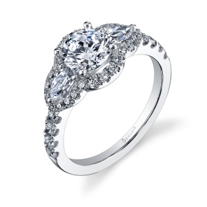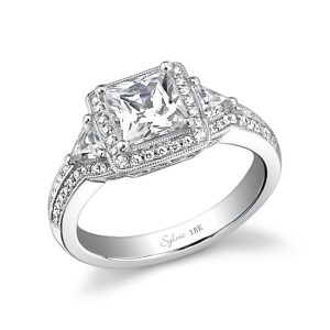 The Sylvie Collection already includes thousands of setting options. This season , the new settings are all about unique details. Lots of floral inspirations and a variety of stones on 3-stone engagement rings. Such as pears or trapezoids surrounding a round center or princess for a very sophisticated look.