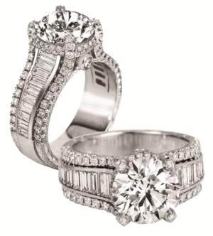 Jack Kelége new engagement ring collection features beautiful baguettes settings and intricate details. Each piece is handcrafted and delicate geometric patterns add a vintage touch to these stunning rings.