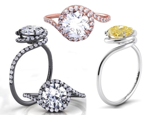 The Abbraccio engagement ring by Danhov is one of a kind. This unique design is all about movement and so unique. It comes in an array of different colors for the center stone, metal and different setting details options.
