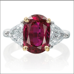 This three stone oval ruby ring is accented by matched trillion cut diamonds.