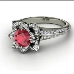 This lotus-shaped engagement ring features a beautiful red ruby.You can customize your own version of this ring in an array of color.