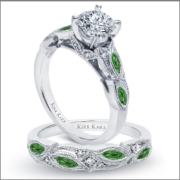 This vintage inspired engagement ring and wedding band set is accented with marquise cut green tsavorites.