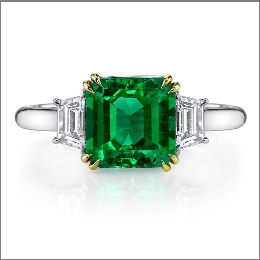 This emerald is surrounded by two trapeze shape diamonds. It is set in a bi-color gold setting.