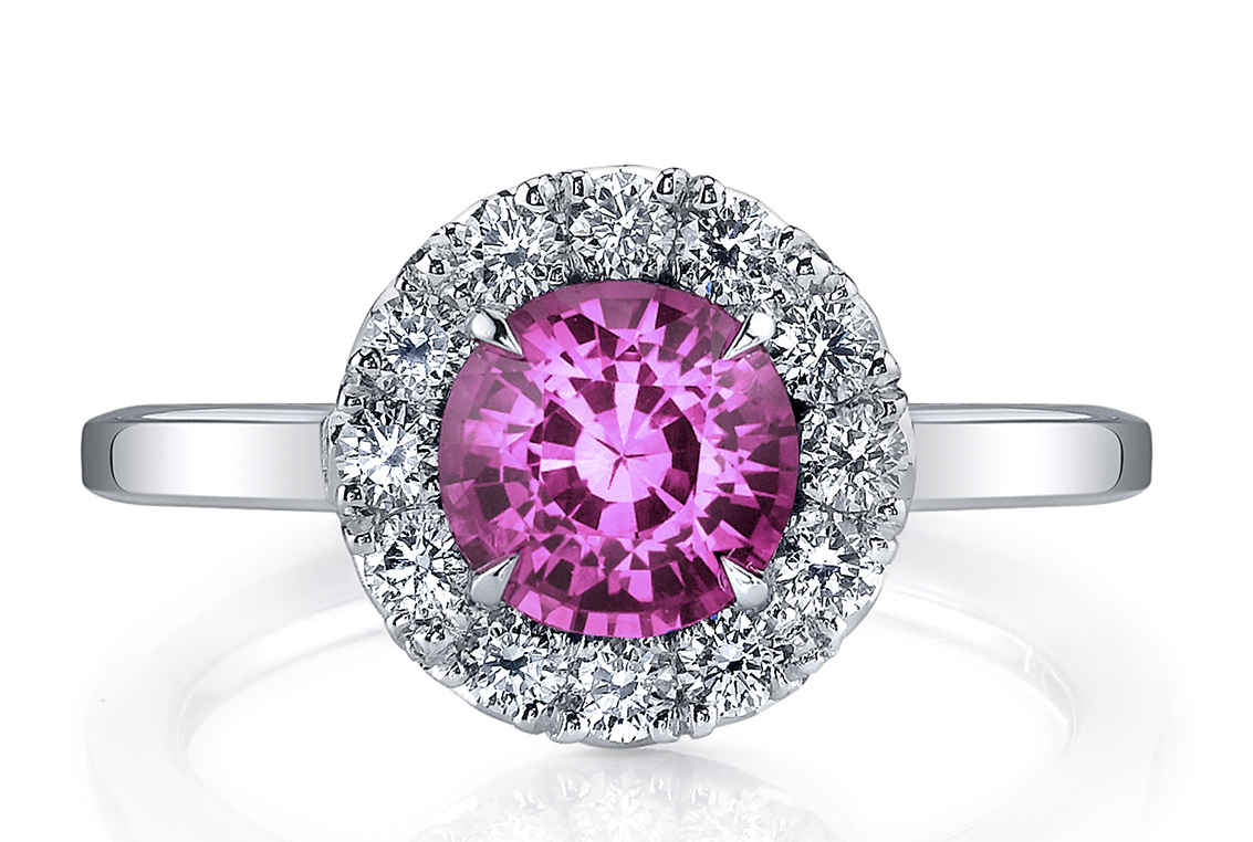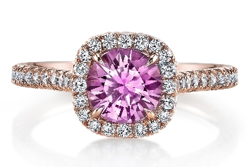 Omi Prive Signature collection features colorful engagement rings with prices ranging from $3125 to $7000. You can chose any color gemstone you can think of such as your birthstone or his. You can also customize the metal selection and include rose, yellow or white gold. Here is a selection of our favorites: