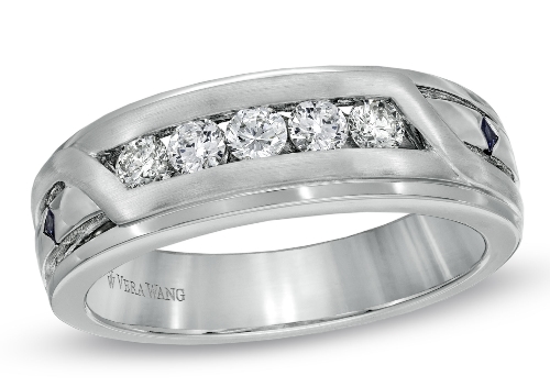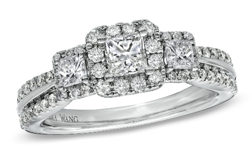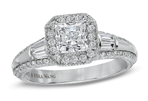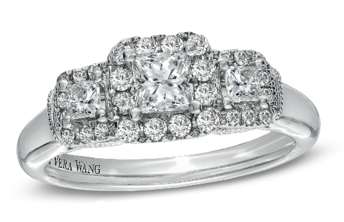 Priced between $1,999 and $4699. The new Vera Wang LOVE engagement ring collection features lots of three stones designs and sparkly halos. You can also get a man wedding bands to match your ring! Here is a selection of our favorites.