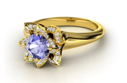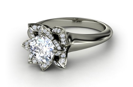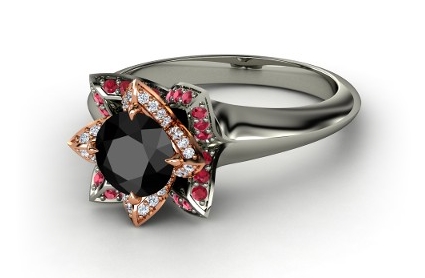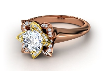 Gemvara engagement rings are custom build for each customer through a great online tool. It allows you to pick your setting, metal and center, but also from an array of colors! (Prices starts at $1,500).We picked the Lotus Ring to present a few options. For this specific ring, there are 5 things to pick: your center stone, the first accent gem, the second accent gem, the precious metal as well as the setting metal for the center gems. Here are a few examples: