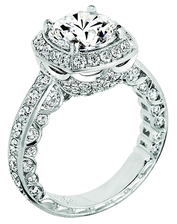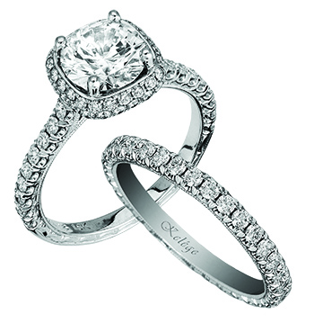 Jack Kelége new engagement ring collection features halo rings with sparkly settings. These platinum and diamond rings revisit classic patterns while keeping a modern look. We love the side baguettes on the ring bellow.