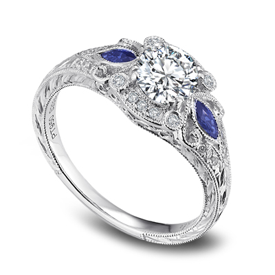 We love this vintage inspired Vanna K engagement ring. The sapphires add a nice touch of color for a trendy ring!