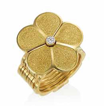The new collection also features a gorgeous daisy ring bracelet. This ingenious mechanism originated in the heart of the Turkish bazaar. The ring unfolds into a daisy chain of concentric gold rings. Check it out!