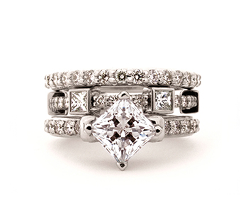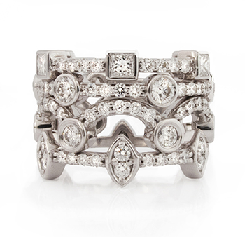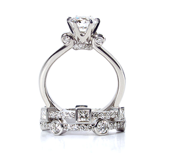 Shelly Purdy 2013 engagement ring collection, “The Royals”, was inspired by Kate and William’s wedding. Canadian round and square diamonds are suspended in 14-karat white gold crown settings shaped like famous tiaras, while a marquise-cut diamond engagement ring features an imperial cross pointed with tiny blue sapphires. The rings stack with many interlocking diamond bands, one even reminiscent of the crenulations on the Tower of London.