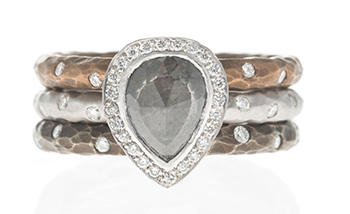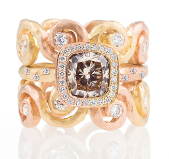 Pamela Froman’s new 2013 engagement rings and wedding bands collection’s features unique modern yet timeless designs with mixed colors of gold, as well as chocolate, yellow and black diamonds. On the “Pastel Wedding” Bridal Set above, the three rings stack together beautifully, or either band can be paired with the solitaire ring. (Solitaire ring; $9,900; Eternal Scroll Band : $3,080; Tri-Color Eternity Band: $5,280)