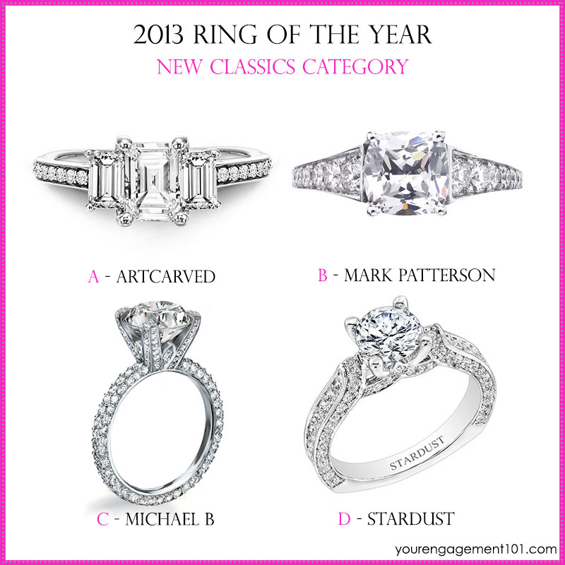 We need your help! We have gathered the rings you liked the most this year. The new classics category features a new take on the classic solitaire. Here are the finalists for the new classics category of 2013: emerald cut diamond three stones diamond engagement ring by Artcarved, round cut solitaire on eternity band by Michael B, vintage inspired solitaire by Stardust and cushion cut solitaire by Mark Patterson. Cast your vote and tell us which one is your favorite!