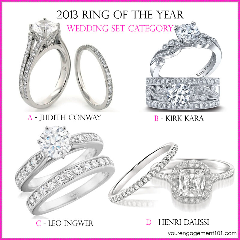 It’s time to cast your vote! Here are the four wedding sets you liked the most this year. The selection features classic settings and eternity bands by Leo Ingwer, Henri Daussi and Judith Conway as well as a vintage inspired set with intricate details by Kirk Kara. Let us know which one is your favorite!