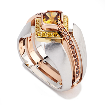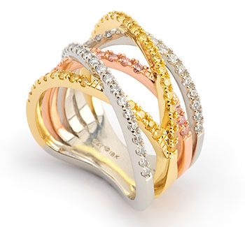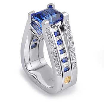The new Coffin and Trout engagement ring collection features innovative designs with gorgeous hints of colors. We love the ring above, from the Interlace collection, which includes a blue sapphire center stone and diamonds and blue sapphire accents. Other rings include natural colored diamonds in sparkly elaborate geometrical settings. Enjoy!