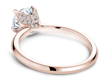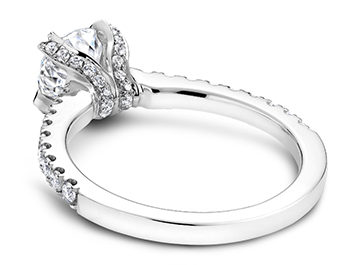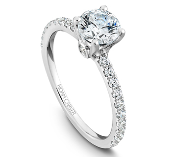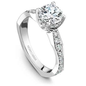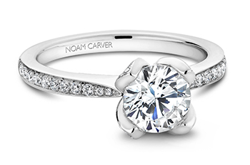 Solitaire engagement rings don’t necessarily call for simplistic designs. Montreal based Noam Carver‘s bridal collection features beautiful solitaires with crowns shaped like delicate flowers. Retail starts at $1,400 not including the center stone.