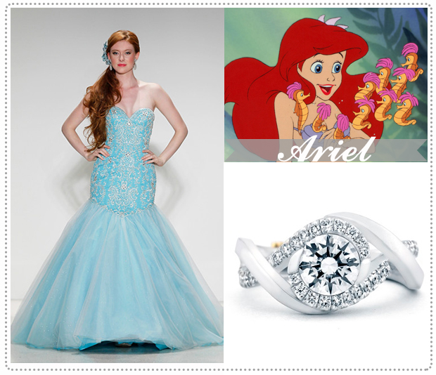 For Ariel and her treasures, this unconventional flared gown in a bright blue turquoise layered with glitter to shimmer like sunlight on the waves would love the company of this swirly engagement ring by Mark Schneider.