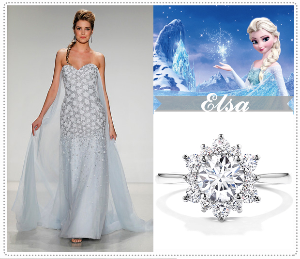 Inspired by Elsa from Frozen, this icy-blue gown with snow-like beading gives a bold yet elegant look to the fairy tale bride. A stunning snowflake engagement ring like this one from Hearts on Fire is the perfect match.