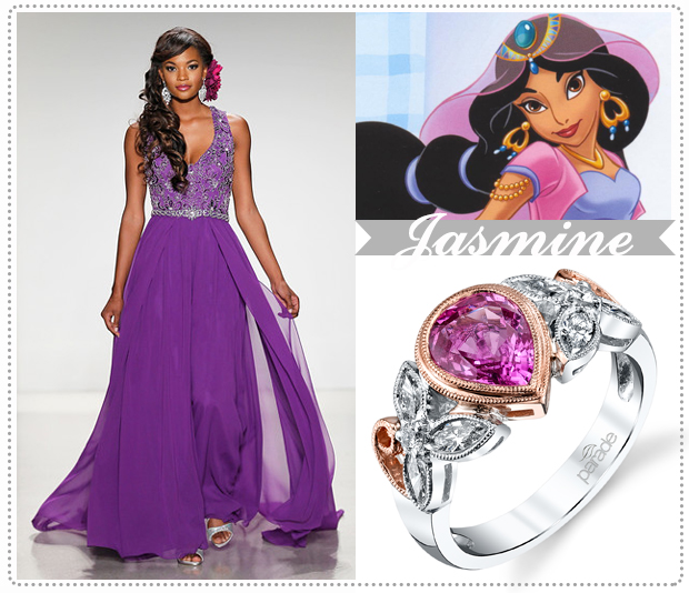 For a daring and colorful look, check out this modern jumpsuit with crystal beading that sparkles like stars in an Arabian night. Jasmine’s bohemian look calls for lots of colors and romantic details. This stunning Parade Design engagement ring with a pink pear shaped center stone is the perfect fit!