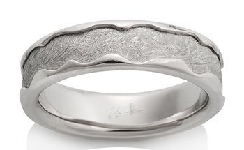 Framed into a wavy rolled platinum edge, the striking natural pattern of the meteorite brings a bold and raw style to this wedding band.