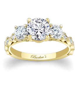For a fabulous classic look, here is a Barkev’s three stone yellow gold engagement ring.