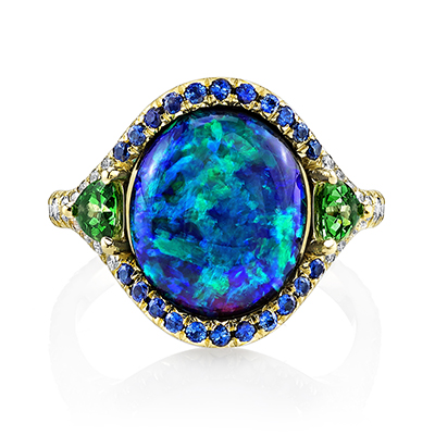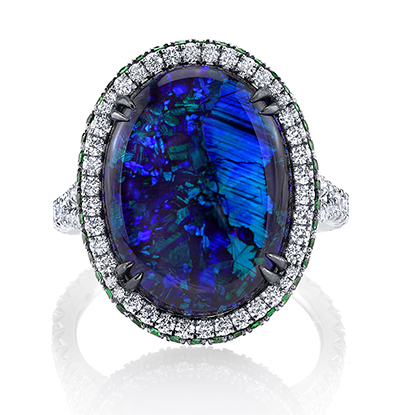 In love with color gemstones? Get lost in the intense beauty of the black opal above, surrounded by round sapphires and and trillion tzavorites in an explosion of vibrant colors. You’re looking at the Grand Prize Winner of the 2015 JCK Jewelers’ Choice Awards & Winner of the 2015 W Magazine Readers’ Choice Award, a stunning ring by Omi Privé. This one of a kind piece is $26,500.