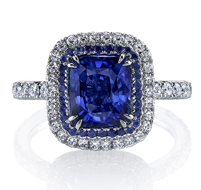 Want something more classic? This deep blue cushion cut sapphire is set in a double halo of round sapphires and brilliant diamonds. It retails for $40,500.