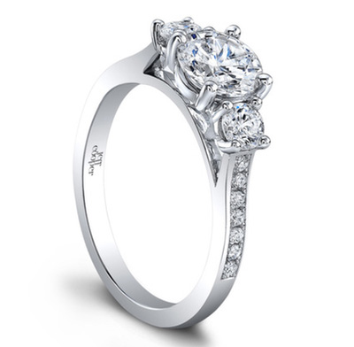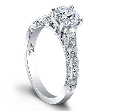We love the amazing details of this engagement ring. Look closely at the flowing wave design engraved with a scatter of sparking accents stones on the side. Round pave set diamonds also run half way down the shank with millgrain finish, a perfect pick for the romantic girl.