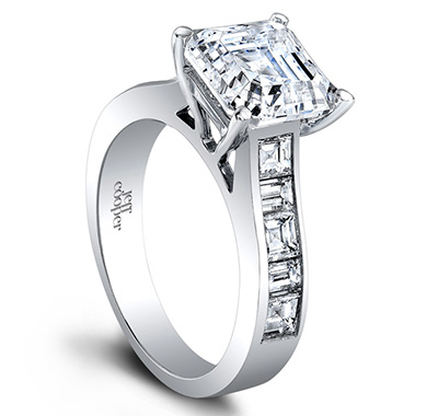Alternating step cut carre diamonds and straight, step cut baguette diamonds on the side bring a clean, yet unique look to this stunning engagement ring.