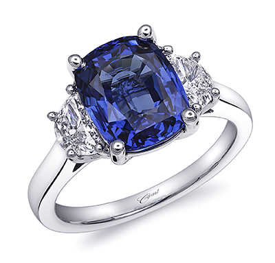 A three stone ring with a sapphire center stone is a good traditional pick for an engagement ring. This design brings a modern touch to a classic style with two moon cut diamonds on the side.