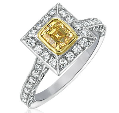 We also love the Tiara ring, a fancy yellow diamond center stone nested in a glorious square halo.