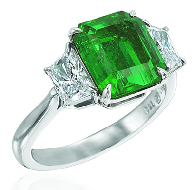 The deep green of this emerald engagement ring shines in between two trapeze cut diamonds.